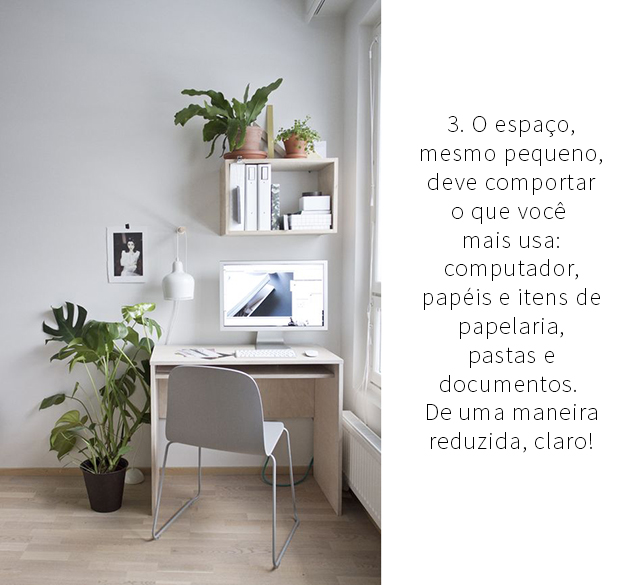 3 – Lembre-se de que o home office deve ter utilidade e comportar o que você mais usa: computador, papéis/canetas/itens de papelaria, pastas e documentos. É claro que, como o espaço vai ser reduzido, é preciso ser feita uma seleção do que realmente deve ficar a sua disposição. Se não couber tudo, deixa à mostra só o extremamente necessário e guarde o resto em outros armários da casa.