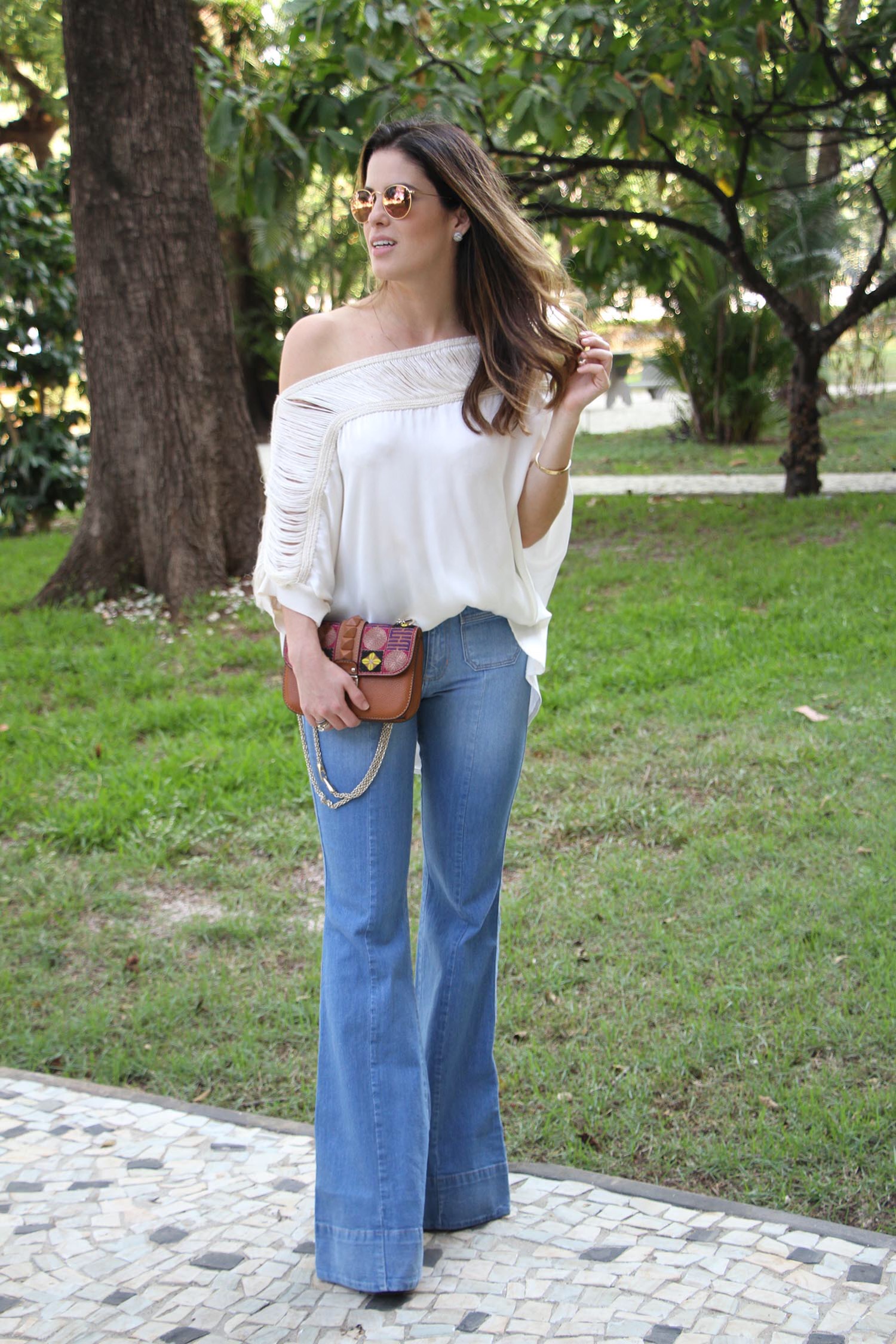 Para completar, blusa à la “bata” nude que deixa um dos ombros de fora e é bem feminina e charmosa! Adoro esse detalhe desfiado da parte de cima dela, que dá mais “interessância” em um toque urbano à peça, rs! Esse corte é bem fresquinho e voltou com tudo agora! Ideal para lidar bem com os dias de mais calor, além de dar um tom “sensual” na medida. Essa coisa ombro a ombro também é bem 70’s!