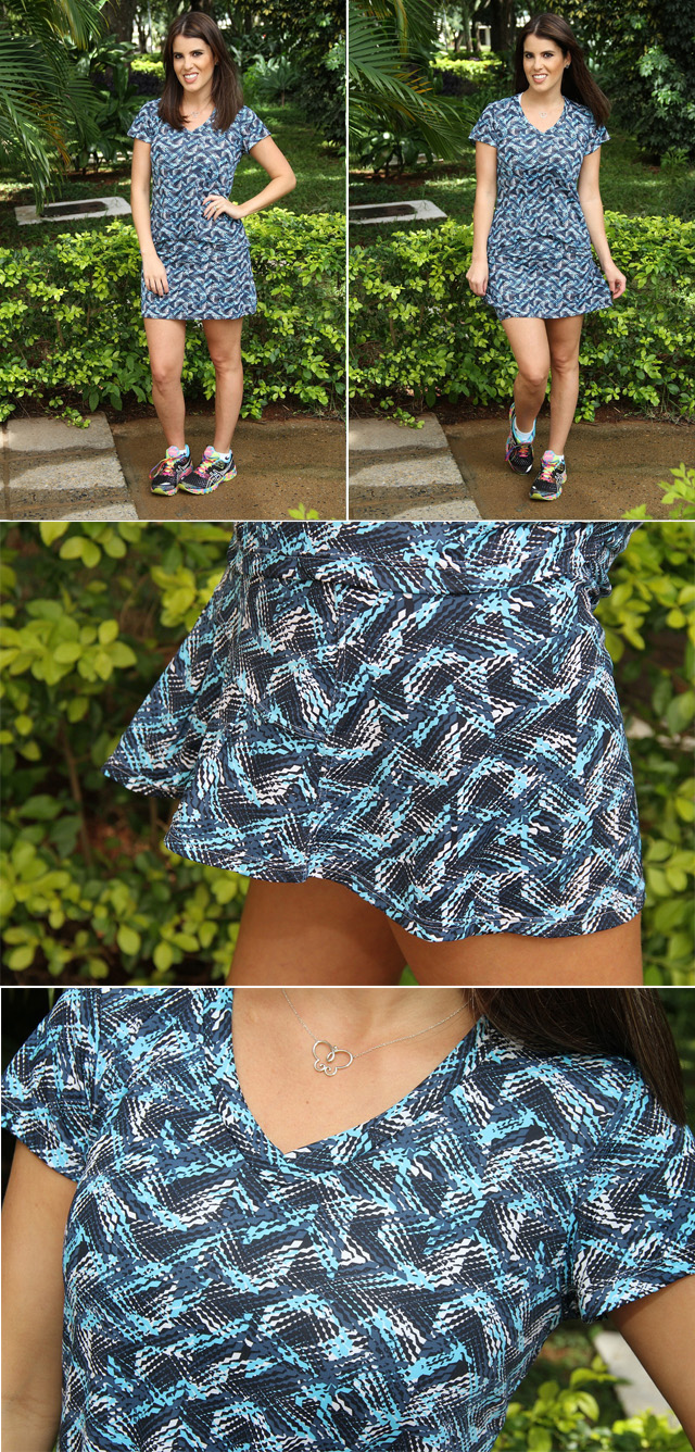 Para quem não curte uma regatinha que tal uma camiseta com gola “v” de poliamida ?! Super fresquinha e veste muito bem. O short saia na mesma estampa segue a linha do primeiro de onça e conta com shortinho compridinho e mega confortável por baixo. É ótimo para correr! Já usei e aprovei muito!!! E o detalhe plissado na parte de trás? Viram que fofura?! Lindo!