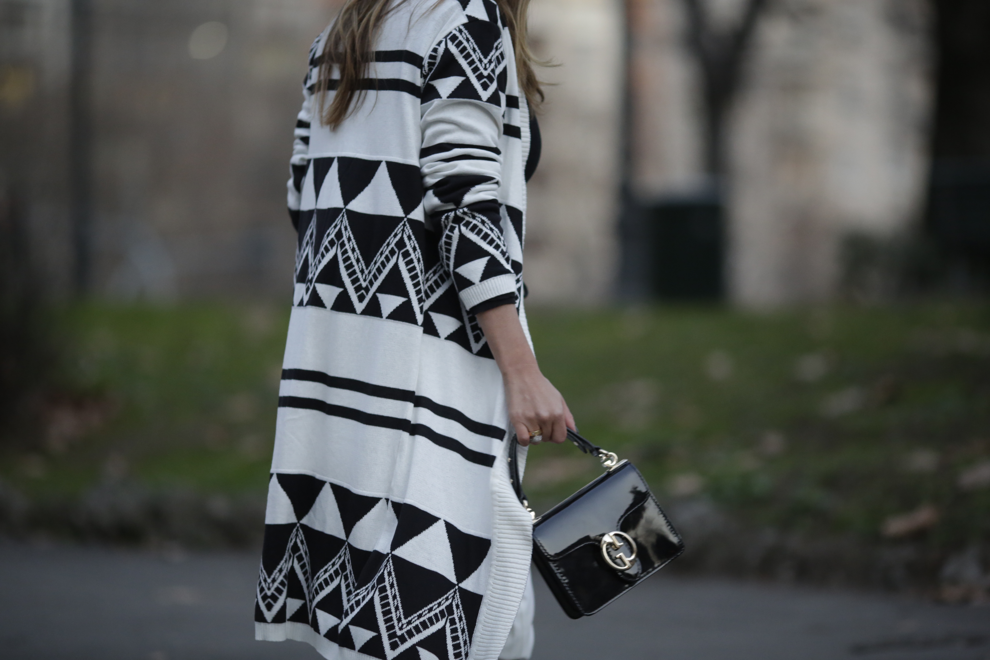 Finalizando, mini bag Gucci que é fofa e super coringa! O scarpin preto básico foi uma escolha confortável e cool para não fugir da trend monocromática desse look.