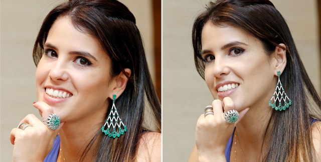 Destaque para as esmeraldas, que representam o verde-louro e ornam os brincos e o anel Pantanal.